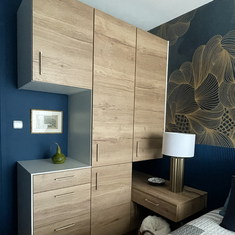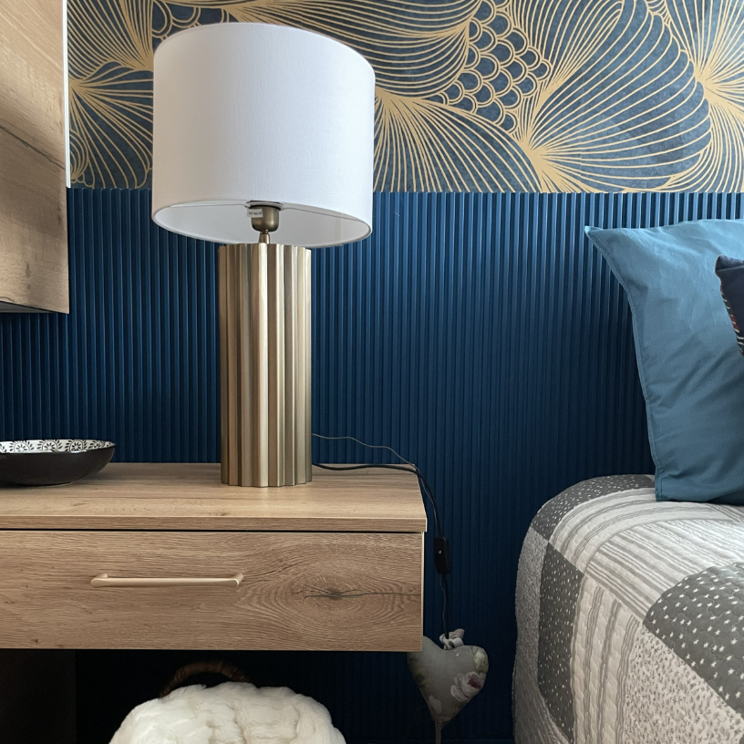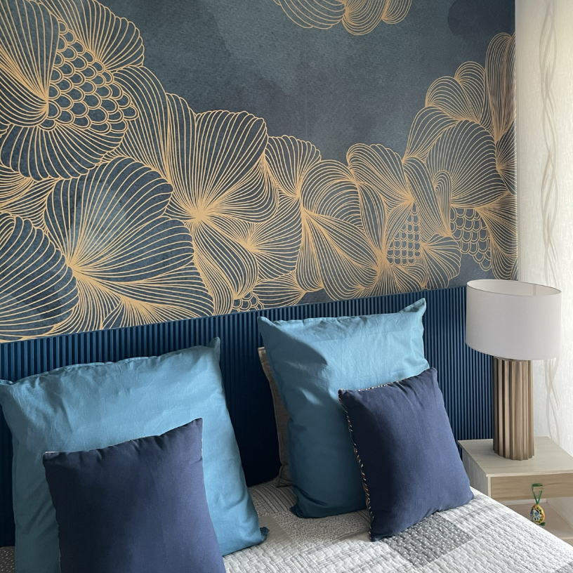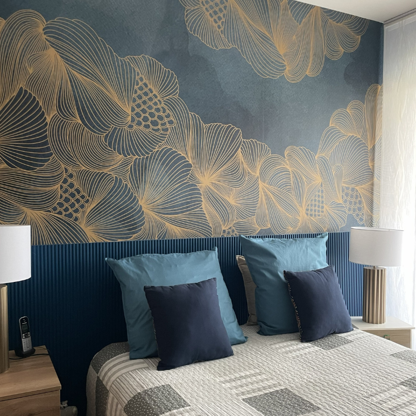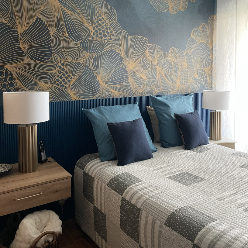 Le point de départ de cette ambiance : un papier peint somptueux, aux nuances profondes de bleu et aux touches dorées, qui apporte caractère et sophistication.