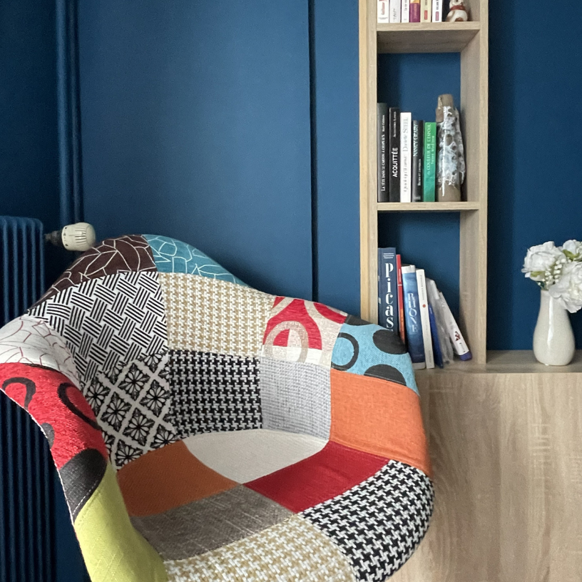 Cette nouvelle chambre incarne douceur, caractère et confort : un véritable cocon feutré, pensé pour le quotidien de ma cliente.