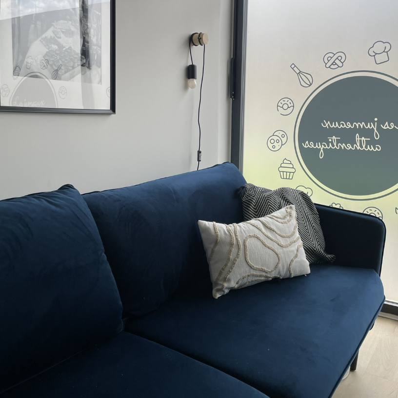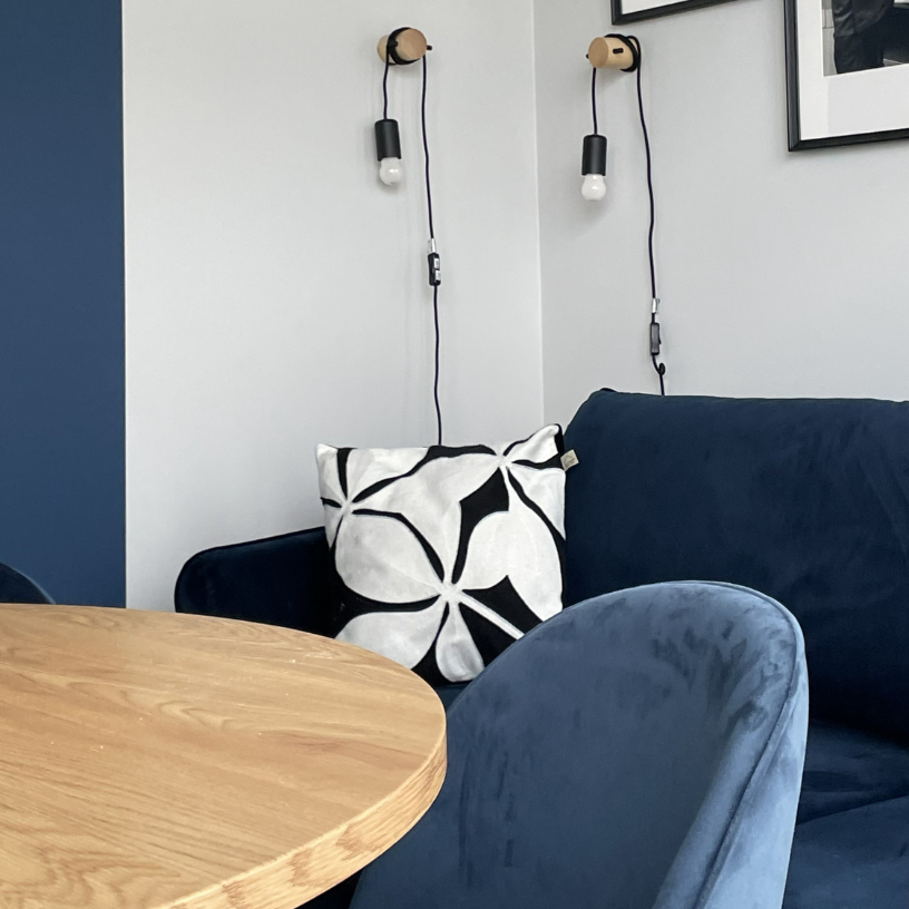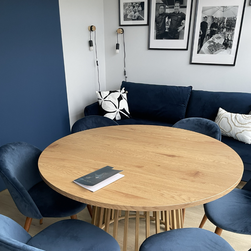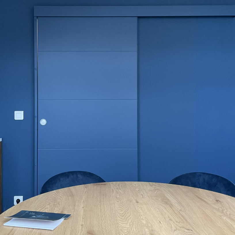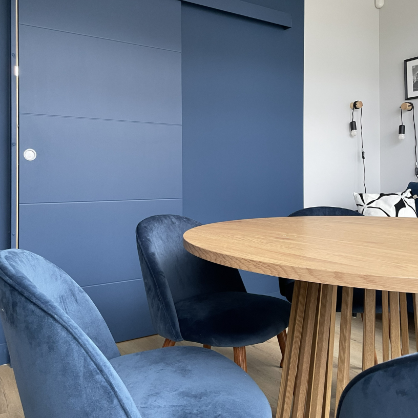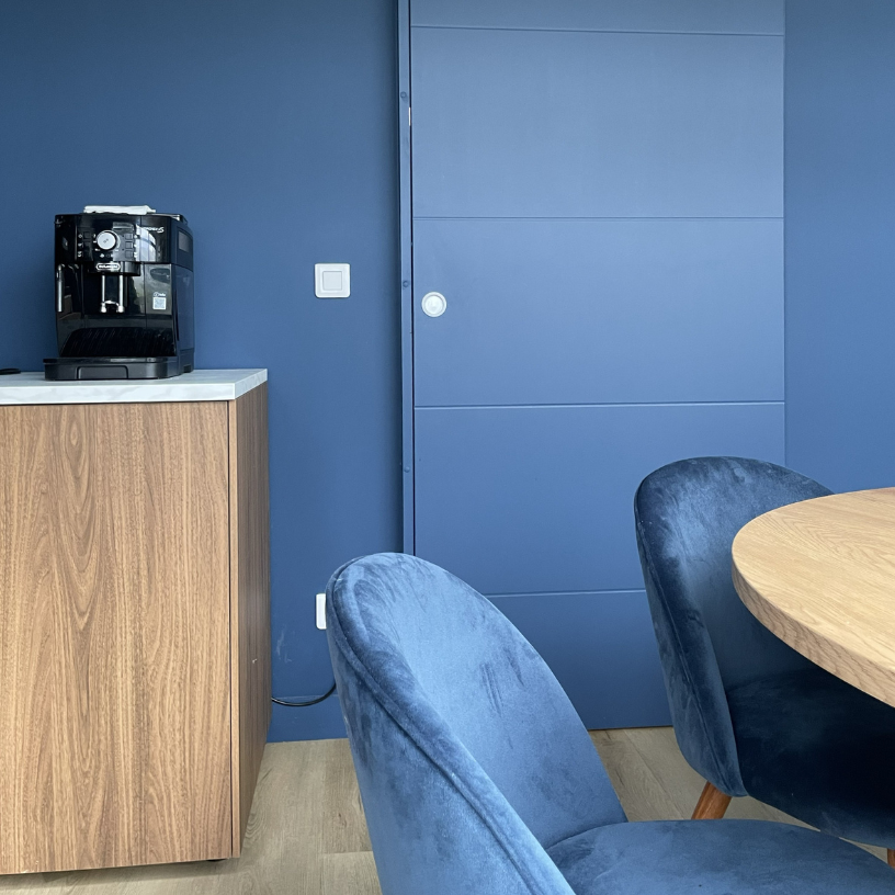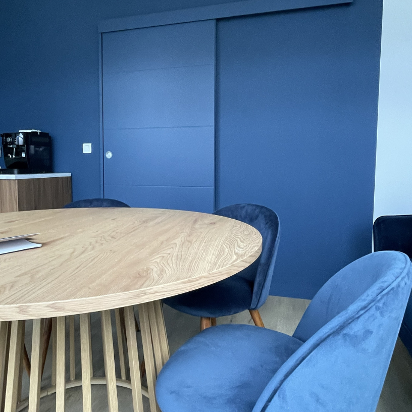 J’ai choisi de travailler autour de matériaux naturels comme le bois clair, pour sa chaleur et sa simplicité, associés à une palette de tons clairs, pour répondre à leur souhait d’un espace lumineux. Pour donner du caractère et une identité forte à ce petit lieu, j’ai introduit un bleu profond, raffiné et enveloppant, qui structure l’espace et marque visuellement les esprits.
