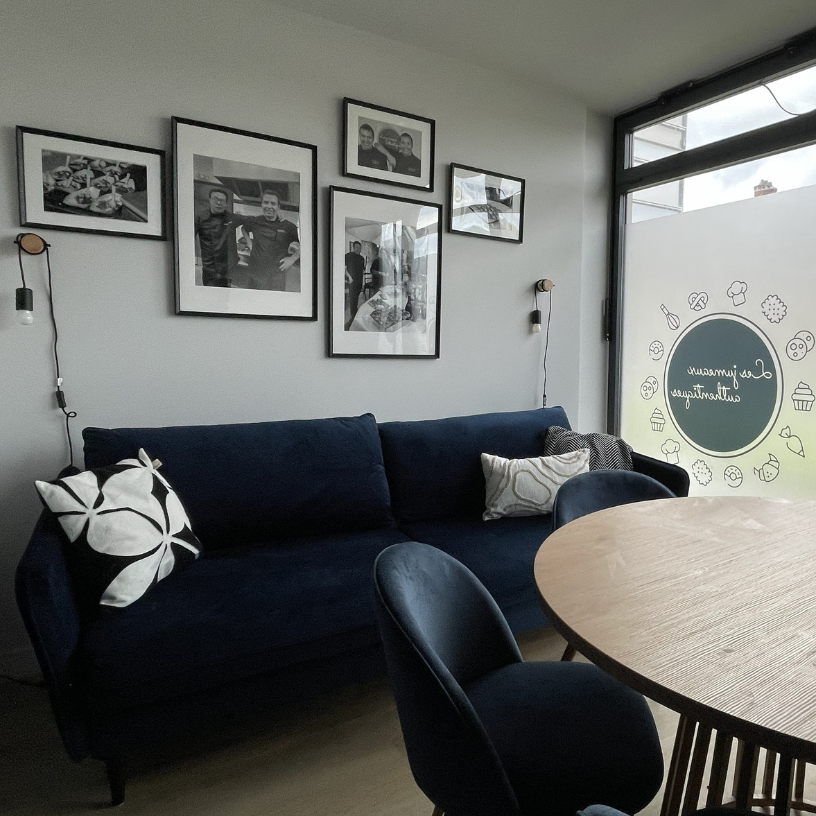 - et une mise en scène murale avec des cadres photos des traiteurs, notamment aux côtés de chefs renommés auprès desquels ils ont travaillé, pour ancrer visuellement leur histoire et leur expérience.