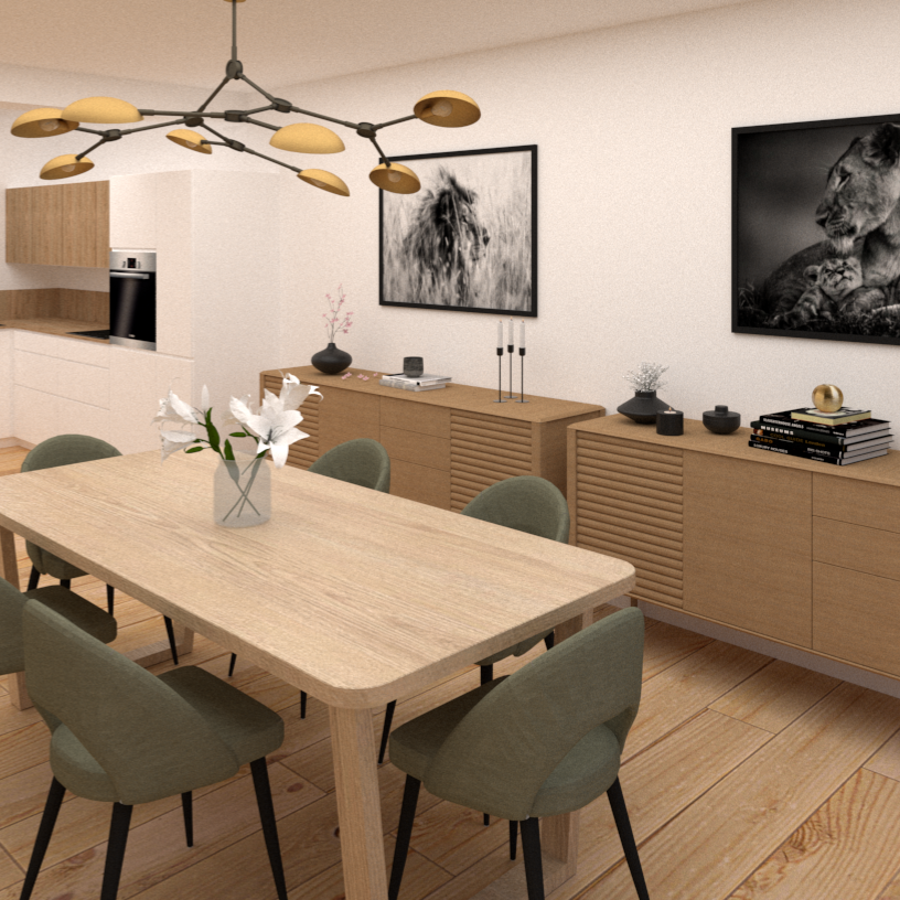 Dans le prolongement du salon, j’ai imaginé une salle à manger lumineuse pouvant accueillir 6 à 8 personnes, tout en conservant une circulation fluide et légère.