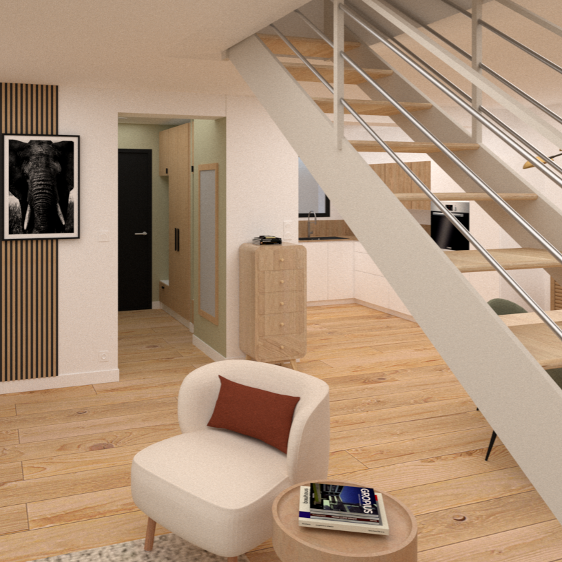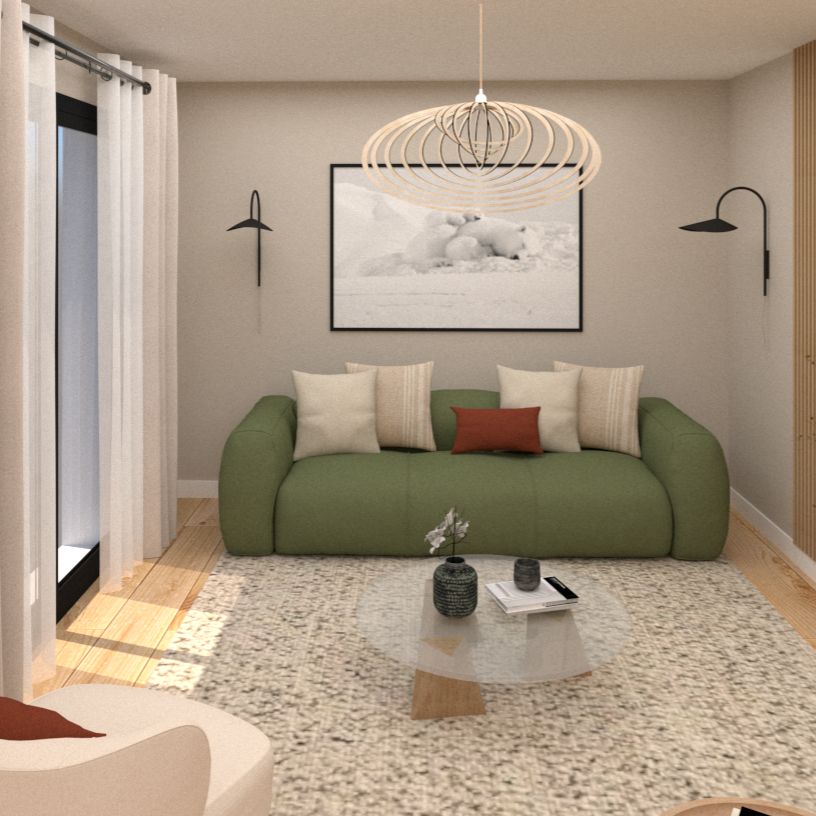 À travers des choix esthétiques maîtrisés, des matières naturelles, des couleurs douces et un agencement réfléchi, j’ai voulu créer un intérieur à l’image de ma cliente : engagé, apaisé et profondément en lien avec la nature.